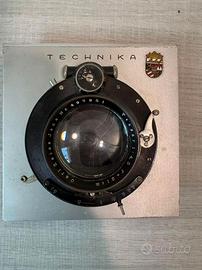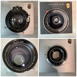 Linhof Technika III in grande formato 4x5, con quattro obiettivi, sei dorsi portapellicola, filtri, mirino, e supporto ottico di un altro marchio.