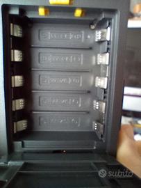 può funzionare con 5 batterie stilo AA con batterie ricaricabili sony tipo np FL 570 F 770 F 970 F 550 F 750 e può funzionare tramite alimentatore elettrico non incluso probabilmente si posso caricare le stesse batterie ma io non lho mai provato