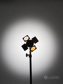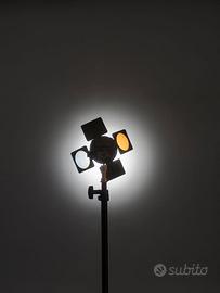 Dotata di barndoor a 4 ante: due solide nere per il controllo della luce e due con gelatina diffusore e filtro CTO per bilanciare la temperatura a tungsteno.