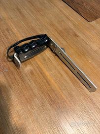 In alluminio con impugnatura in resina e suo laccetto in pelle.