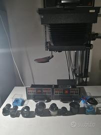 INGRANDITORE IFF AMPLIATOR S2 B Con seguenti obiettivi: 50mm 2,8 Componon-s 60mm 5,6 Coponon 80mm 4 Rodagin 180mm 5,6componon 210mm 5.6 Rodagon 240mm 5,6 Componon 2Condensatori (x 35mm fino al 13/18) Piano aspirante, 3 Lampade da normale a puntiforme, Porta filtri Essicatrice Fraco e tutto l'occorrente per lo sviluppo (Vasche, spirale ecc. ) Vendita solo in blocco!