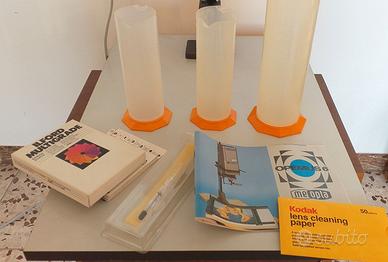 Ingranditore bianco e nero per stampa fotografie Meopta "Opemus 6" munito di obiettivo Rodestock Rodagon 1: 5.6, (fino a 32), f 80, sagomatore - mascheratore Meopta 30x40 cmm, 6 vassoi sviluppo, arresto, fissaggio 30×40 e 20x30, provette, filtri multigrado, termometro, cartine pulizia lenti, manuale istruzioni. COMPLETO a 250 €.