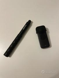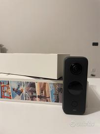 Action cam a 360 gradi, con scatola originale,selfie stick allungabile, treppiedi e memoria esterna. È presente custodia in tessuto e gommino per coprire l’obiettivo.