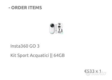 Vendo insta 360 GO 3 con “Pack sport acquatici” la fotocamera è pari al nuovo, mai utilizzata, anche il dive case è nuovo mai toccato l acqua. Senza neanche dirlo accessori e attacchi vari nuovi mai usati. (È saltato un progetto messa nel cassetto mi usata). Potete vedere dalle foto che è tutto nuovo, pagata €533 vendo a meno della metà. Preferita consegna a mano, scrivete solo se realmente interessati.