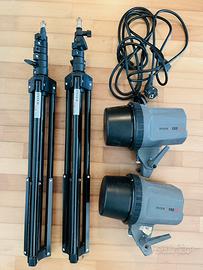 Interfit EXD200 Kit flash home studio ✅ Potenza regolabile con incrementi di 1/10 per un controllo preciso. ✅ Tensione di sincronizzazione di 5 V per l'utilizzo con tutte le prese del computer. ✅ Il dispositivo slave integrato ignora fino a 3 pre-lampeggi. ✅ Conferma acustica di carica. ✅ Treppiede alto 2 mt ✅ Usato ma in buone condizioni. ✅ Ho anche i paraluci. ⚠️Un stantuffo del trippiede è daneggiato (non sale, vedi foto) ⚠️ il materiale dei flash sono appiccicosi penso sia per l’uso. ⚠️Se siete interesatti vi mando altre foto.