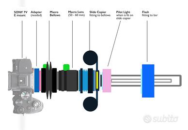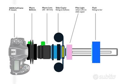 Descrizione Sistema modulare per digitalizzare ad alta risoluzione diapositive 35mm intelaiate, negativi o dia in striscia. Basato su soffietto macro UNITOR (produzione OEM condivisa con Minolta, Fujica, Konica, Contax, Yashica, ecc.), soffietto rifatto con stoffa in CORDURA impermeabile e super robusta, struttura metallica, guide precise e regolazione continua dell’estensione. Ottica: • Helios MC 44-7 58mm f/2 (attacco M42x1) – 6 elementi/4 gruppi tipo Biotar • Diaframma a preselezione manuale • Ottimale per riproduzioni macro, condizioni eccellenti. • ( Escludibile dalla vendita x €. 40 - se siete già in possesso di un ottica adeguata .) Rapporto di Riproduzione : • Estensione 1:1 → ~58 mm, range 1:2 fino >1:1 • Copertura completa fotogramma 24x36 mm • Su sensori: 24 MP → >4000 dpi, 36 MP → ~5500 dpi, 45 MP → >6000 dpi Qualità finale proporzionale al sensore. Illuminazione : • Flash HANIMEX (4x AA) → elimina micromosso • Supporto flash in alluminio con slitta con regolazione longitudinale per controllo preciso dell’esposizione in funzione del diaframma • Luce pilota LED per centratura, messa a fuoco del fotogramma. Illuminazione uniforme e rapida, ideale per archivi estesi Compatibilità: • Attacco posteriore Nikon FX - Full Frame oppure M42x1 • Attacco anteriore ottiche M42x1 • Possibile modifica con altri attacchi fotocamera su richiesta. Flusso di lavoro: 1. Inserimento diapositiva/negativo 2. Centratura con luce LED 3. Scatto flash sincronizzato 4. Eventuale tethering diretto a PC per controllo immediato. Contenuto della Vendita: • Video demo per l’utilizzo. • Soffietto macro UNITOR in Cordura • Duplicatore dia 35mm • Supporto negativi • Supporto flash in alluminio • Luce pilota LED • Obiettivo Helios Multi Coated 44-7 58mm f/2 • Flash Hanimex CX 418 modificato con cavetto Lungo Sincro-X Non inclusi nella vendita Testa Manfrotto, Nikon D850 e stativo visibile nelle foto senza la fotocamera Nikon.