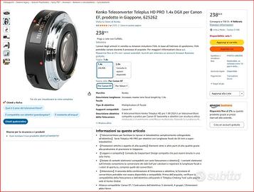 Kenko Teleconverter Teleplus HD PRO 1.4x DGX per Canon EF, come nuovo , usato un paio di volte. Tappo anteriore e posteriore.La serie HD PRO è la top di gamma di Kenko (usa vetri Hoya). Rispetto alla versione economica "HD", questa mantiene una nitidezza molto alta, quasi indistinguibile dal Canon Extender 1.4x II, ma a un prezzo decisamente inferiore. Prezzo leggermente trattabile