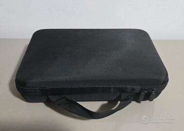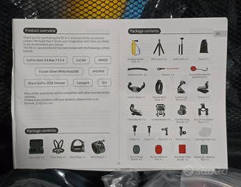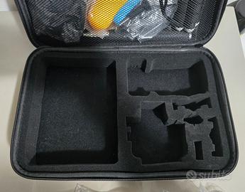 Kit accessori 50 in 1 per action cam, con pratica valigetta per il trasporto. La valigetta ha il fondo in gomma piuma sagomato per alloggiare un action cam più i suoi accessori.