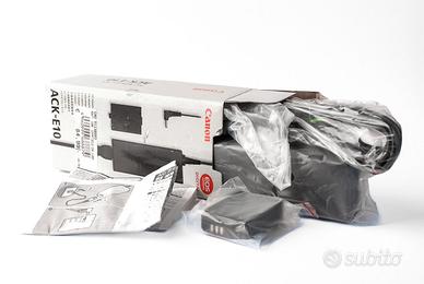 Kit Canon ACK-E10 Nuovo, giacenza di magazzino,composto da Alimentatore Canon CA-PS700 + Accoppiatore Canon DR-E10 consente di alimentare/ricaricare la reflex Canon direttamente da una presa a muro ed è progettato per fornire alimentazione ininterrotta alla fotocamera. Simulatore per batteria LP-E10 per alimentazione continua e caricatore LC-E10 . Ideale per periodi di ripresa prolungati senza interruzioni, dalla fotografia timelapse alle interviste. Basta sostituire la batteria della tua reflex digitale compatibile con l'accoppiatore Canon DR-E10 a corredo e collegare quest'ultimo all'alimentatore Canon CA-PS700 compreso nel kit per agganciarti direttamente alla rete elettrica durante l'uso prolungato. Adatto per fotocamere Canon EOS 1100D 1200D 1300D T3 Kiss X50. EOS Rebel T3 T5 T6 T7 T100, EOS Rebel 1100D 1200D 1300D 1500D 2000D, 4000D, Kiss X50 X70 X701 X80 X90. ATTENZIONE! Non per EOS REBEL T3i, T5i, T6i, T6i, T6i. 7iM.