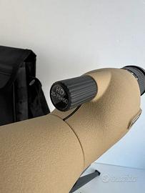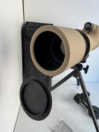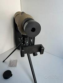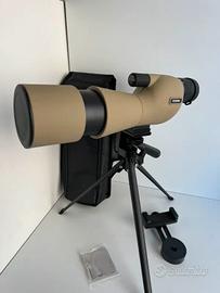 Cannocchiale da osservazione (spotting scope) angolato, comunemente usato per il birdwatching, il tiro al bersaglio o l'osservazione della natura. Con una risoluzione di 25-75x60 marcata Feirsh. Componenti del Kit Corpo del Cannocchiale: Design angolato a 45 gradi in colorazione sabbia/tan. Treppiede: Supporto pieghevole nero in metallo per una visione stabile. Adattatore per Smartphone: Supporto per collegare il cellulare all'oculare e scattare foto o video. Accessori: Custodia morbida per il trasporto e panno di pulizia in microfibra. Caratteristiche Principali Ingrandimento: Zoom variabile da 25x a 75x. Obiettivo: Lente frontale da 60 mm per una buona raccolta di luce.
