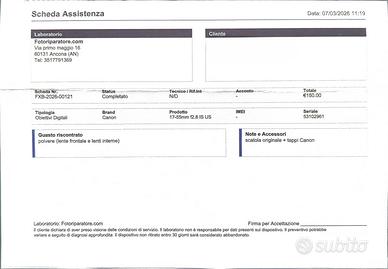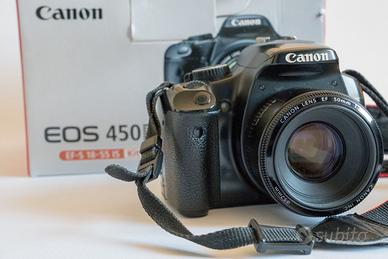 Fotocamera Reflex EOS 450D usata ma in buone condizioni, completamente funzionante. Contatore scatti: 17824. Obiettivi inclusi: -Canon EF-S 17-55mm f/2.8 IS USM pulito di recente presso laboratorio in data 7/3/2026 (vedi scheda) che fornisce 6 mesi di garanzia, comprensivo di filtro polarizzatore circolare Hoya 77mm, paraluce originale EW-83J, tappo anteriore, tappo posteriore, scatola di imballaggio originale. -Canon EF-S 55-250mm f/4-5.6 IS in ottime condizioni completo di tappo anteriore, tappo posteriore, scatola di imballaggio originale -Canon EF 50 1.8 II in ottime condizioni con scatola di imballaggio originale Inclusi: -batteria funzionante -scatola originale -caricabatterie LC-E5E