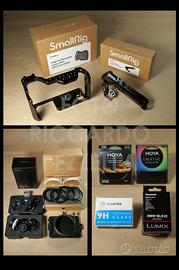 Vendo kit comprensivo di fotocamera Panasonic Lumix DC-GH5M2 (SHTCNT-Scatti totali: n.89), M4/3 - Micro Quattro Terzi (con scatola ed accessori originali Panasonic), ottiche Cine ed accessori. Kit pronto per l'uso, chiavi in mano, rivolto a creatori di contenuti "cinematografici" (scuole cinema, registi, videomaker cortometraggi, ecc.) con accessori ed ottiche con focali 35mm e 85mm con controlli in manuale. Modello noto in ambito professionale per essere rivolto alla ripresa video per le sue caratteristiche. Gli accessori sono i seguenti: Ottiche Cine: - Samyang T1.5/35mm Cine Lens MFT (made in Korea) - Samyang T1.5/85mm Cine Lens MFT (made in Korea) Accessori Smallrig: - n.1 Smallrig Cage for Panasonic GH5II mod. CCP2646 (con scatola ed accessori) - n.1 Smallrig Universal ARRI Locating Top Handle mod. 2165C (con scatola) - n.1 Smallrig mini Matte Box Lite mod. 3575 (con scatola e accessori) - n.1 Smallrig mini Follow Focus mod. 3010C (con scatola, custodia ed accessori) Accessori aggiuntivi - II Batteria Lumix DMW-BLK22 - n.1 Ulbter LCD Screen Protectors per display fotocamera - n.3 schede SD da 64GB (n.2 Sony SF-64UX2 94MB/s SD XC I e n.1 SanDisk Extreme PRO 95MB/s SD XC I 3 - 10) Fotocamera ed accessori in perfetto stato, praticamente nuovi (fotocamera acquistata in data 30/09/2023 ed usata poche ore per progetto non andato a buon fine e tenuta come fotocamera di scorta mai usata), ottiche con presenza di leggerissimo pulviscolo invisibile in ripresa. Disponibile ad effettuare prove accurate con il kit montato con la persona interessata all'acquisto. NO SPEDIZIONE. RITIRO A MILANO.