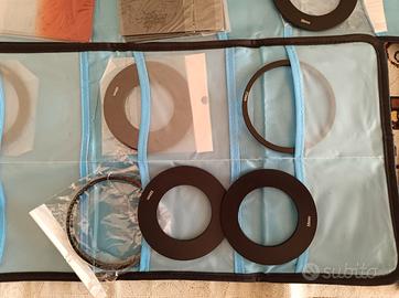 Filtri a lastra: Diversi filtri rettangolari, alcuni graduati (con un gradiente di colore o densità, come quelli blu e rossi/arancioni visibili) e altri a densità neutra (grigi/marroni). Questi vengono utilizzati per alterare la luce che entra nell'obiettivo.