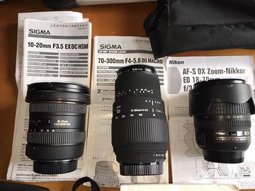 Kit completo per fotografia digitale composto da: - Fotocamera Nikon D80 tenuta benissimo, 22.690 scatti, con manuali istruzione e libro fotografico Nikon - Zaino tracolla LOWEPRO con protezione impermeabile estraibile, porta cavalletto e scomparti regolabili - Obiettivo NIKKOR af-s dx ed 18-70 f/3.5 - 4.5 con paraluce e tappi - Obiettivo SIGMA 70-300 f4-5.6 DG MACRO con borsa, paraluce e tappi - Obiettivo grandangolo SIGMA 10-20 F3.5 Ex DCHSM con borsa, paraluce e tappi - Flash ESDDI PLF-650 con borsa e accessori vari per comando a distanza ecc - Tutti gli obiettivi dotati di filtri UV removibili con loro astucci originali - Treppiede UNOMAT SVA2000 completo di custodia a tracolla.