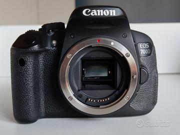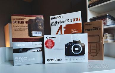Kit fotografico composto da fotocamera CANON EOS 700 D, Battery grip con doppia slot per batterie e pulsanti di controllo integrati, obiettivo Canon 50 mm, obiettivo TAMRON 18-270 mm con stabilizzatore, obiettivo TAMRON Macro 90 mm, Flash esterno Yongnuo TTL utilizzabile sulla slitta della fotocamera o come flash esterno a infrarossi, accessori vari ( telecomandi di scatto remoto, tubo di prolunga formato da tre anelli separabili, doppio caricabatterie, filtro UV, filtro Polarizzatore) Confezioni originali e Borsa con tracolla inclusi. Prezzo leggermente trattabile