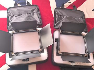 Luce bicolore regolabile 3200K – 5600K Intensità dimmerabile Alta resa cromatica CRI 96+ Alette direzionabili (barn doors) incluso: 2 pannelli led, alimentatori, custodie per trasporto