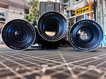 Splendida macchina analogica medio formato Mamiya RB67 professional in un completissimo kit composto da corpo macchina con mirino a pozzetto in ottime condizioni, soffietto perfetto, nessuna infiltrazione di luce. Tenuta con cura e recentemente revisionata. Due magazzini per rulli da 120 in condizioni perfette. - Mamiya sekor C 65 F 4.5 - Mamiya sekot 90 3.8 - Mamiya sekor 180 4.5 Tutte e tre le lenti in ottime condizioni, niente funghi e muffe, vetri limidi e puliti. Tutti e tre tengono perfettamente anche i tempi più lunghi, testati singolarmente per il loro ottiratore centrale. Acquistati in Giappone. - Impugnatura verticale con scatto remoto - Tubo di prolunga macro Mamiya n. 2 Tutto completo di tappi. Sempre custodito da fotografo professionista. Kit completo pronto a scattare con la magia del medio fornato. In regalo 3 rulli da 120 e uno scatto flessibile. Vendo tutto in blocco il kit (non solo lenti o corpo)