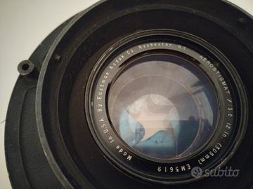 Vendo obiettivo Kodak Aerostigmat 305 mm f/5.0, presumibilmente da banco ottico, purtroppo non ne conosco le caratteristiche. Si tratta di un oggetto voluminoso e piuttosto pesante. Segnalo piccola scheggiatura nella lente posteriore.