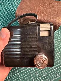 Fotocamera Kodak Brownie Hawkeye, un'icona della fotografia analogica americana, prodotta da Eastman Kodak a partire dal 1949 fino agli anni '60. Questo modello è noto per il suo design box-style compatto, la semplicità d’uso e il grande impatto nel rendere accessibile la fotografia a tutti.