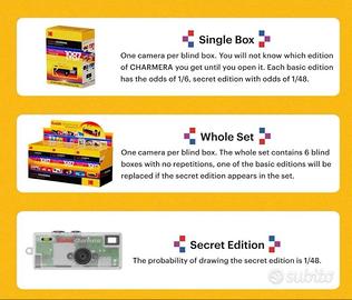 La KODAK CHARMERA è una piccola fotocamera digitale che supporta sia lo scatto di foto che la registrazione video. In modalità foto sono disponibili cornici personalizzate KODAK, filtri vintage e datario. In totale, 7 stili retrò sono venduti in blind box, aggiungendo divertimento e collezionabilità per te e i tuoi amici!