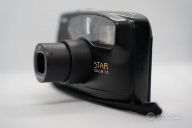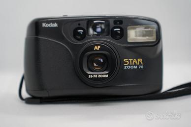 Kodak Star Zoom 70, fotocamera compatta analogica a pellicola 35mm, semplice e affidabile, ideale per chi cerca una point & shoot senza complicazioni. È dotata di obiettivo zoom 35–70mm con autofocus, perfetto per fotografia quotidiana, viaggi e street photography analogica.