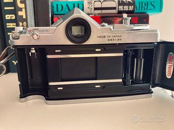 Splendida Konica Auto reflex Revue im eccellenti condizioni. Corpo + Obiettivo Hexanon 52mm 1.8 Macchina in grado di scattare sia full fram che half frame. *esposimetro non testato Caratteristiche Principali • Tipo: Reflex analogica 35mm (SLR) con otturatore meccanico. • Funzione Dual Format: Selettore sulla parte superiore per passare da 24x36 (36 foto) a 18x24 (72 foto). Il mirino si adatta con delle linee di riferimento. • Attacco Obiettivi: Konica AR (Bayonet II). Gli obiettivi originali Revue sono solitamente marchiati solo "Hexanon". • Otturatore: Copal Square S metallico a scorrimento verticale. • Tempi di scatto: Da 1s a 1/1000s + posa B. • Sincronizzazione Flash: X-sync fino a 1/125s (molto veloce per l'epoca).