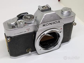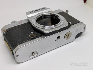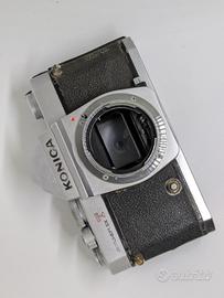 Macchina vissuta ma funzionante. Rara versione che usciva di fabrica con il mirino split. È l'ammiraglia totalmente meccanica della Konica. Non in perfette condizioni (vedi foto) ma utilizzabile con rullino.