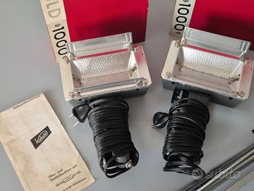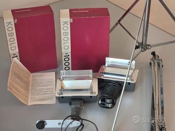Vendo due illuminatori per cinema anni 60, modello Kobold 1000, prodotte in Germania Fornite con cavalletti originali, interamente metallici, pieghevoli. Le lampadine alogene da 1000W non sono incluse. Stupendi oggetti da collezione, in ottimo stato e funzionanti. Lampade e cavalletti per 40 Eu in totale. Spedizione gestita da Subito oppure ritiro a mano se in zona Torino.