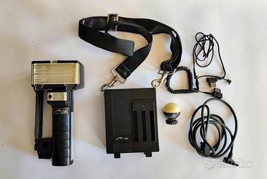 Lampeggiatore Flash Metz Mecablitz 60 CT4 completo di staffa , cavetti di collegamento, fotocellula, così come mostrato in foto. No accumulatori, no confezione originale. A suo tempo usato pochissimo. Nella foto manca il caricabatteria ma c'è pure.