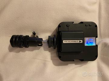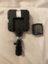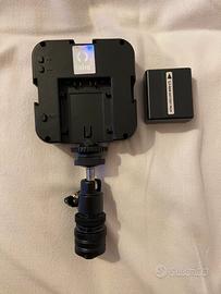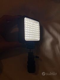 faretto LED portatile per fotografia e video, comunemente chiamato "LED Video Light". Il dispositivo: utilizzato per illuminare soggetti a distanza, ideale per vlog, interviste o fotografia. La batteria: Utilizza una batteria ricaricabile agli ioni di litio esterna. Includo batteria compatibile visibile in foto. Controlli: Sul retro sono presenti i tasti "+" e "-" per regolare l'intensità della luce (dimmer) e un tasto ON/OFF. un accessorio molto utile per migliorare l'illuminazione quando i video o le foto risultano troppo bui o piatti. Marca take, finzionante, con custodia.