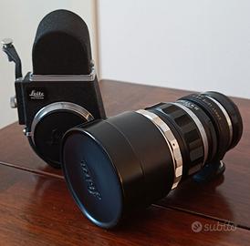 Obiettivo NUOVO , senza alcun segno . Nella vendita è compreso il Visoflex III anche questo nuovo con raro tappo originale con parte interna in metallo verniciato nero . Come visibile dalle foto in dotazione c'è anche l' anello OUBIO di raccordo da Leica a vite a Visoflex , anello dotato di attacco per cavalletto.