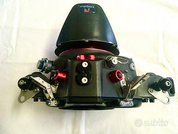Custodia Leo3 EasyDive revisione 9-10-2024, Oblo 160, Vacuum System, attacchi Flash 2 connettori Nikonos e 2 a fibra, Comando a Distanza 3metri. Basetta per Canon 5D mk3, Basetta per Canon R6, Chiavetta per aggiornamento firmware.