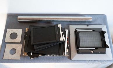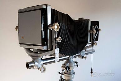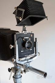 Linhof Kardan color 20x25 con adattatore 13x18 , schassis 13x18 18x24 20x25, base per soffietto standard e prolunga, soffietto maggiorato per macro in ottime condizioni, paraluce. Stativo originale Linhof con testa panoramica.Ottica Symmar 300 mm f 5,6. certificati di garanzia Linhof.