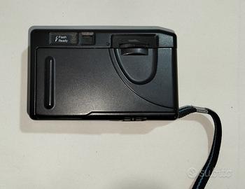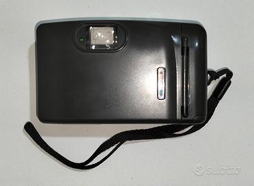 Fotocamera analogica compatta con flash, custodia Nikon originale e batterie Toshiba/Varta. Manca il rullino. Presenta una piccola crepa vicino al pulsante di scatto ma funziona bene comunque.
