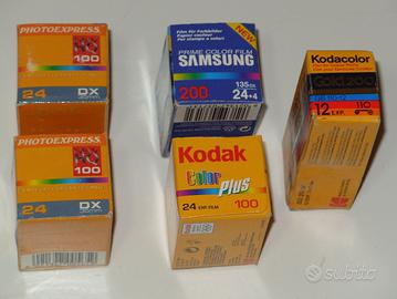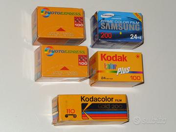 Lotto di 5 rullini / pellicole nuove scadute varie marche vintage , fra cui un raro rullino 110 / 12 Exp. Kodak Gold200 con scadenza 1989.