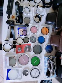 In vendita un'ampia ed eclettica collezione di attrezzatura fotografica vintage, ideale per collezionisti, amanti dello sviluppo in camera oscura o fotografi digitali che utilizzano lenti vintage tramite adattatori. Il lotto è composto da componenti ottici e sistemi di illuminazione d'epoca conservati con cura. Contenuto del Lotto: Ottiche e Filtri: Selezione di obiettivi vintage (focali varie) completi di paraluce originali (cilindrici e a petalo) Set di Filtri e Ottiche: Vasta gamma di filtri circolari (UV, Polarizzatori, Sky) di marchi leader come Hoya, Tamron e Cokin. Include porta-filtri a lastrina e numerosi anelli adattatori di vari diametri. Illuminazione: Diverse unità flash, tra cui un flash Tumax e modelli compatibili stile Braun Hobby, completi di accessori di sincronizzazione, e un'unità flash Braun VarioZoom 340 SCA con testa girevole e cavo remoto TTL Nikon SC-17, fondamentale per sessioni flash off-camera. Specialistica Macro: Raro sistema a soffietto estensibile (Bellows) per fotografia macro ad alto ingrandimento, ideale per dettagli estremi. Supporti: Impugnatura ergonomica a pistola per una maggiore stabilità durante lo scatto e mini-treppiede integrato. Custodie Originali Macchine Fotografiche: Diversi modelli tra cui Nikon CF-35 e CF-36 in ottime condizioni estetiche, perfette per proteggere corpi macchina serie F (F301, F501, FA). Condizioni: Gli articoli sono usati e presentano i normali segni del tempo che ne attestano l'originalità. Le lenti appaiono prive di graffi profondi visibili (non testato elettronicamente). Possibilità di SCONTO!! No spedizione Per ulteriori immagini contattatemi