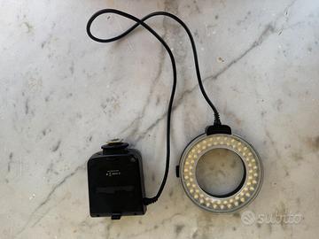 Luce macro a LED fa sia flash che dimmer della potenza attraverso il bottone Compatibile con Canon e Nikon Alimentazione 4 batterie AA Temperatura colore fredda
