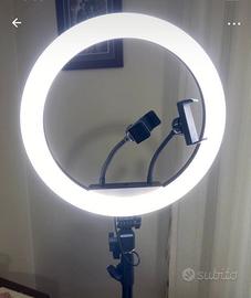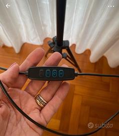Luce da foto con 3 tonalità di colore e intensità regolabile. Doppio supporto per cellulare e varie regolazioni in altezza e inclinazione. Per l'energia è previsto un USB-A da inserire in un adattatore del cellulare o una power bank.