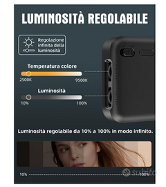 Vendo Luce selfie per telefono , pc , macchina fotografica temp colore regolabile a batteria . Nuovo con scatola e accessori. Luce selfie con temperatura colore regolabile da 2500k a 9000k , ha 96 led , dimmerabile , cri95 , magnetica , a batteria 2000mah per telefono , tablet, PC, fotocamera , action cam. In confezione ha 2 agganci per poterla attaccare al telefono e al pc o tablet con una molla con gomma morbida all'interno per non rovinare i dispositivi. Ha il gancio classico a vite per macchine fotografiche , action cam. Staffetta dietro per appoggiarla in orizzontale. 5 modalità di aggancio totali essendo anche mangentica . Comandi semplici da utilizzare per impostare le varie tonalità di luce e intensità. Batteria con autonomia di circa 3 ore ricaricabile con cavo usbc . Compatta e leggera miasma 10 cm per 10 cm per 2 cm .