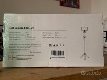 Luce Video LED 3000K-6500K Montabile Ricaricabile USB per fotocamere. L'alta resa cromatica non solo può aiutarti a regolare la luce fredda e la luce calda durante le riprese, ma anche a regolare la luminosità attraverso l'attenuazione continua. Comprato da Amazon e aperto unicamente per poter prendere la misure del treppiedi, che ha un diametro massimo di 27 cm.