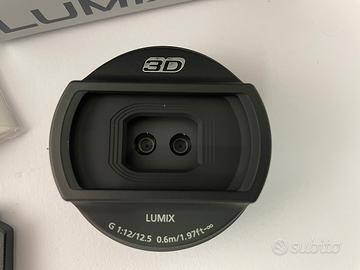 Panasonic Lumix G 12,5mm/ F12 , obiettivo digitale per riprese 3D per la creazione di immagini stereoscopiche .Consente di realizzare all'istante scatti 3 D senza ricorrere a speciali dispositivi per la ripresa tridimensionale. L'obiettivo e' conforme allo standard Micro Quattro Terzi . Completo di scatola , tappo anteriore e posteriore e astuccio