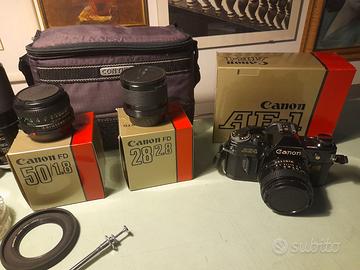Macchina fotografica analogica 35 mm. CANON AE-1 con ottica 50 mm.grandangolo 28 mm. zoom 80-210 triplicatore di focale,filtri,flash elettronico,scatto flessibile,borsa,libretti e scatole originali. Spedisco con mio corriere o ritiro a mano.