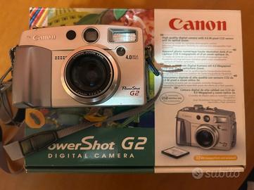 fotocamera digitale vintage Canon PowerShot G2. Ecco alcune delle sue caratteristiche principali: Risoluzione: Sensore CCD da 4.0 Megapixel. Zoom: Obiettivo con zoom ottico 3x. Schermo: Dispone di un monitor LCD orientabile. Supporto di memorizzazione: Utilizza schede di memoria CompactFlash. Con accessori 1 scheda 2 batterie (funzionanti sl 30%) 1 caricabatterie, 1 manico portamacchina, 1 cavalletto