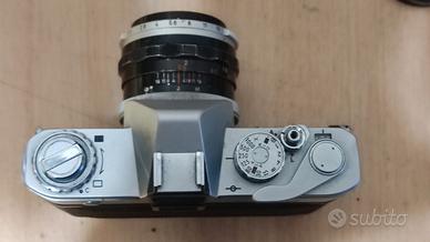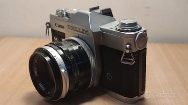 Macchina fotografica Canon Pellix più che vintage in quanto risalente agli anni 60. Macchina particolare il cui specchio non subisce il ribaltamento. Corredata di obiettivo 50 mm f. 1.8 ed un 135 f. 2.5. sempre Canon. Gli obiettivi sono esclusivamente per questo tipo macchina. Sia il corpo, l'esposimetro e le ottiche sono stati revisionati totalmente e perfettamente efficenti. Il 135 è corredato del proprio paraluce e della custodia originale. Oggetto di non facile reperibilità. Prezzo richiesto € 280