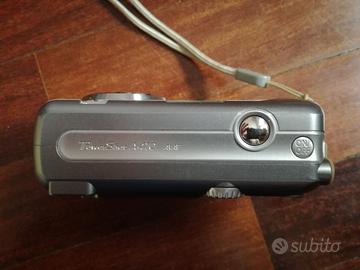 Macchina fotografica Canon PowerShot A410, compresa di scatola originale con manuale in italiano, memoria per le foto e cavo di trasmissione immagini al pc. Ghiera selezionabile (riproduzione foto scattate, auto, manuale, scena speciale e filmato), pulsiantiera per selezione foto (supermacro, ritratto, bambini, animali, fotografia notturna, fogliame, spiaggia, interno, neve, fuochi d'artificio, grandangolo), possibilità di zoom e flash in varie modalità. E' possibile tramite apposito menù modificare o eliminare le foto, porta per la memoria delle foto, funziona con 2 batteria stile ricaricabili e non, fotocamera da 3.2 mega pixel, display da 1.5'' e cordino per il polso.
