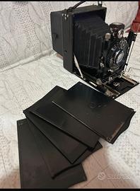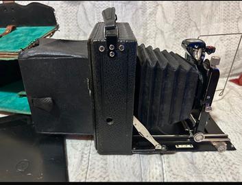 fotocamera a soffietto vintage dotata di un otturatore COMPUR e un obiettivo Unofokal. Tipo: Fotocamera pieghevole a soffietto d'epoca. Otturatore: Compur, noto per la sua precisione nei modelli storici. Obiettivo: Moncben Doppelanastigmat Unofokal 1:4.5-13.5cm. Caratteristica: Dispositivo meccanico che richiede messa a fuoco manuale e impostazione dei tempi tramite ghiere sull'obiettivo. macchina fotografica pieghevole a lastre d'epoca, dotata di un otturatore Compur. Tipo: Macchina fotografica a soffietto per lastre Formato: Probabilmente formato 9x12 cm, comune per questo tipo di apparecchi. Componenti: Include diversi portalastre e una custodia originale con interno in velluto. Stato: Trattandosi di un oggetto d'epoca, potrebbe necessitare di restauro per funzionare. Si prega di notare che le fotocamere d'epoca sono spesso vendute come oggetti da collezione o decorativi, e la loro funzionalità fotografica non è garantita.