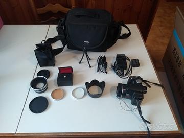 La Panasonic Lumix DMC-FZ28 è una fotocamera digitale. Si distingue per il suo potente zoom ottico e la versatilità, ponendosi come una via di mezzo tra una compatta e una reflex. Specifiche Tecniche Principali Sensore: CCD da 10.1 Megapixel (1/2.33") Obiettivo: Leica DC Vario-Elmarit con zoom ottico 18x, equivalente a un 27-486 mm. Video: Registrazione in alta definizione 720p (1280 x 720) a 30 fps. Stabilizzazione: Stabilizzatore ottico d'immagine (O.I.S.) integrato per ridurre il mosso. Display e Mirino: Schermo LCD da 2,7 pollici e mirino elettronico (EVF). Formati: Supporta sia scatti in JPEG che in RAW, offrendo maggiore flessibilità in post-produzione. Accessori: obbiettivo macro, filtro UV, e Seppia. due batterie, borsa tracolla. e tutti icablaggi e ricariche originali come da foto.
