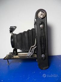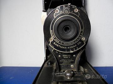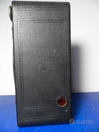 Macchina fotografica Eastman Kodak modello 2A Folding Cartridge Hawk-Eye Model B made in U.S.A. a Rochester (N.Y.). La macchina appare integra e funziona tutto (scatto, diaframma, scelta dei tempi, rotaie del soffietto, rotazione del mirino, etc.). Non si garantisce che riesca a fare ancora foto, non essendo stata provata da molto tempo. La custodia originale in cuoio appare invece malmessa e necessita di una ricucitura di un fianco, come da foto.