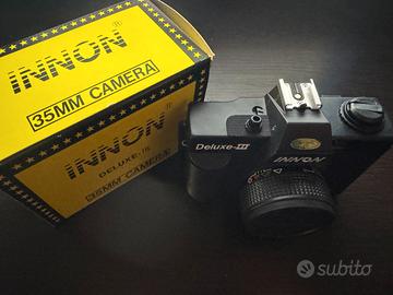 Macchina fotografica Innon 35mm DeLuxe III vintage - Corpo completamente in plastica, con sistema a priorità di diaframma. Ha tutte le caratteristiche per essere una macchina adatta agli amanti della fotografia Lomo. Si puo' definirle la Lomogrpaphy Konstruktor economica. Viene venduta con confezione originale perfetta e manuale d'uso. Prezzo non trattabile