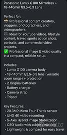 Vendo macchina Fotografica Lumix G100 Panasonic , descrizione nelle fotografie.